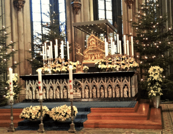 Die Gebeine der Heiligen Drei Könige werden heute im Dreikönigsschrein im Kölner Dom aufbewahrt. Dieses Meisterwerk mittelalterlicher Goldschmiedekunst, das jedes Jahr um den 6. Januar, dem Dreikönigstag, besichtigt werden kann, entstand im 12. Jahrhundert.